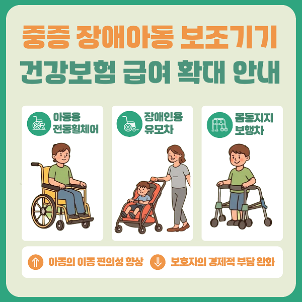 현재 장애인의 이동을 위한 보조기기인 전동휠체어, 수동휠체어와 보행 훈련을 위한 보행차에 대해 건강보험으로 지원하고 있으나, 성인보다 체구가 작은 장애아동에게 적합한 제품은 건강보험 지원이 없어 경제적 부담이 컸다. 이에, 장애아동을 위한 맞춤형 제품이 지원될 수 있도록 보조기기 3종에 대한 항목을 신설한다.